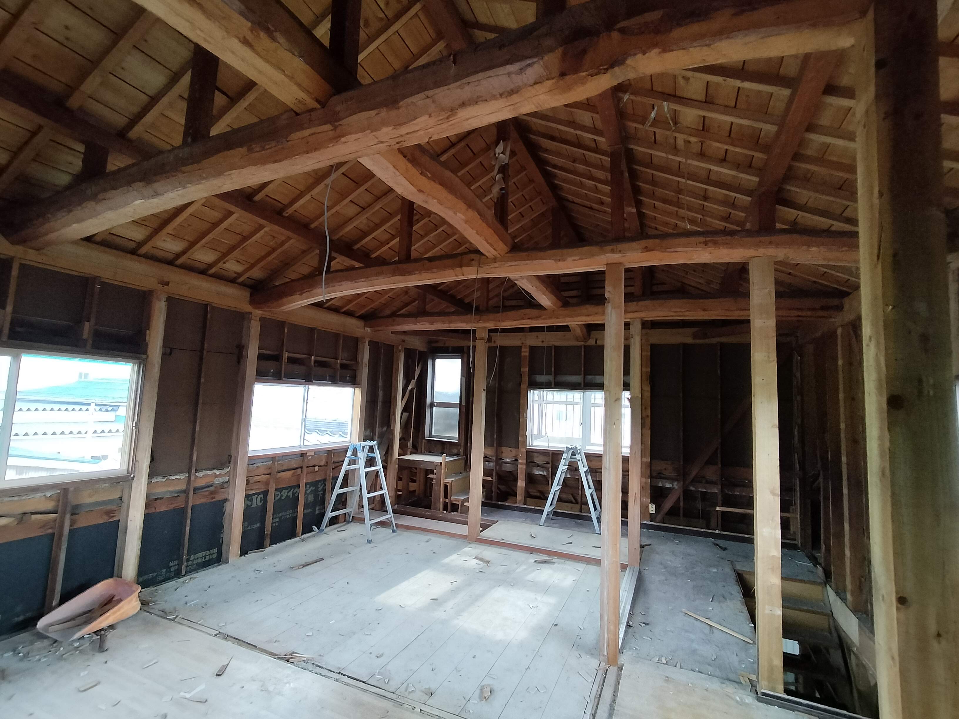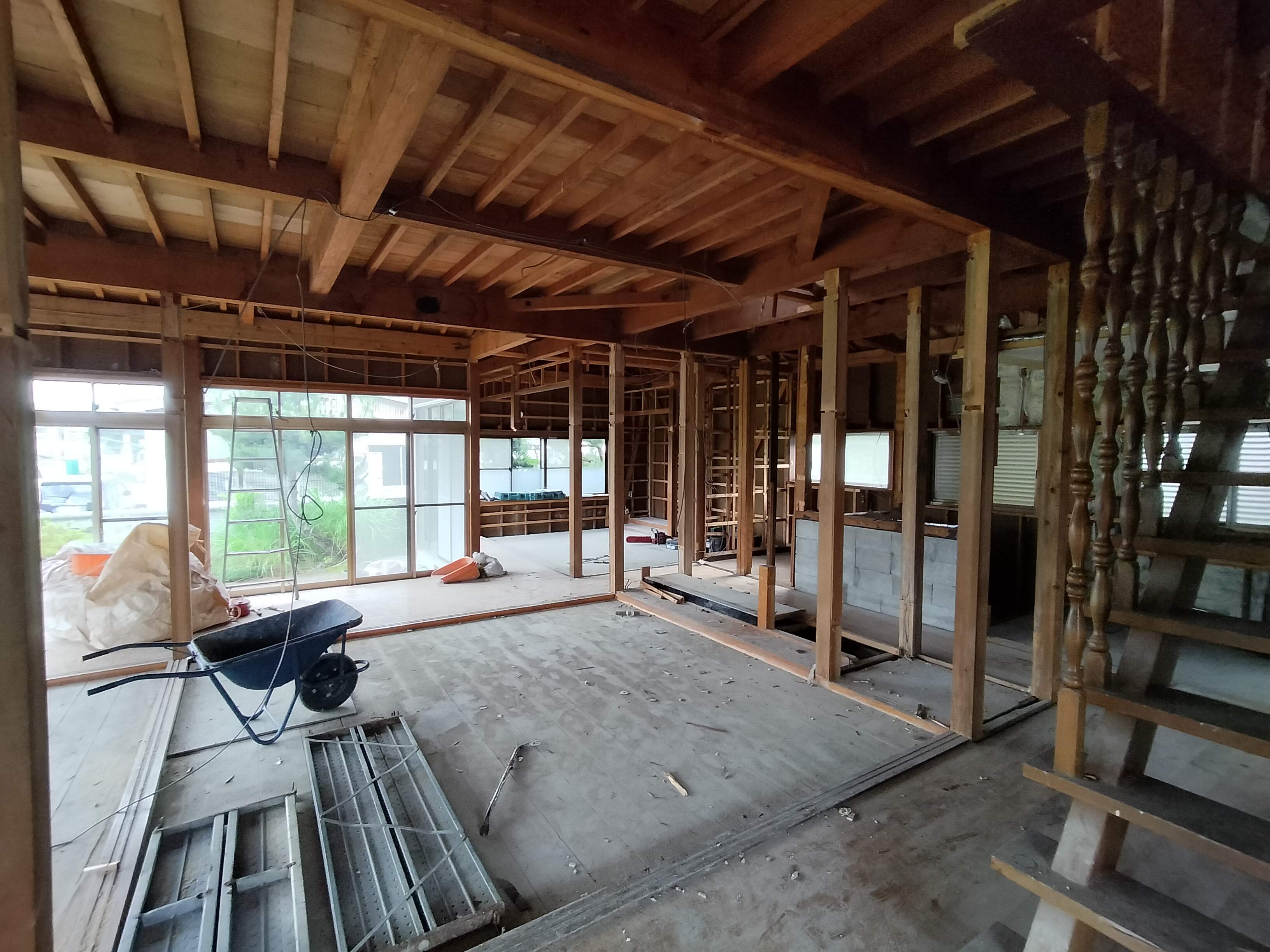 この段階で、解体前では確認が難しかった箇所の梁組みや筋交いの位置などの確認を行いました。本工事が始まるまでに柱の追加や梁の補強、耐震補強といった構造部分の検討を進める予定です。