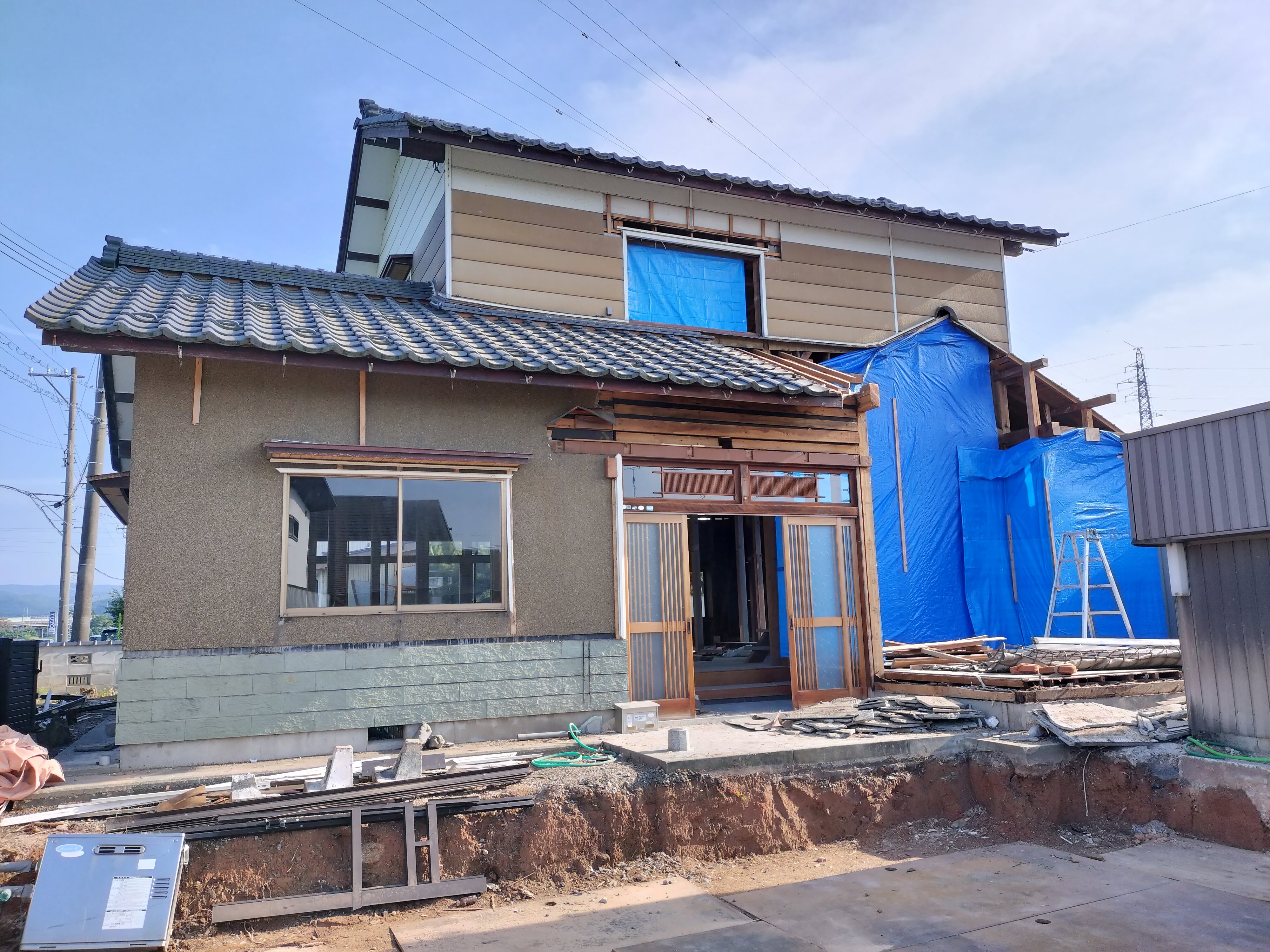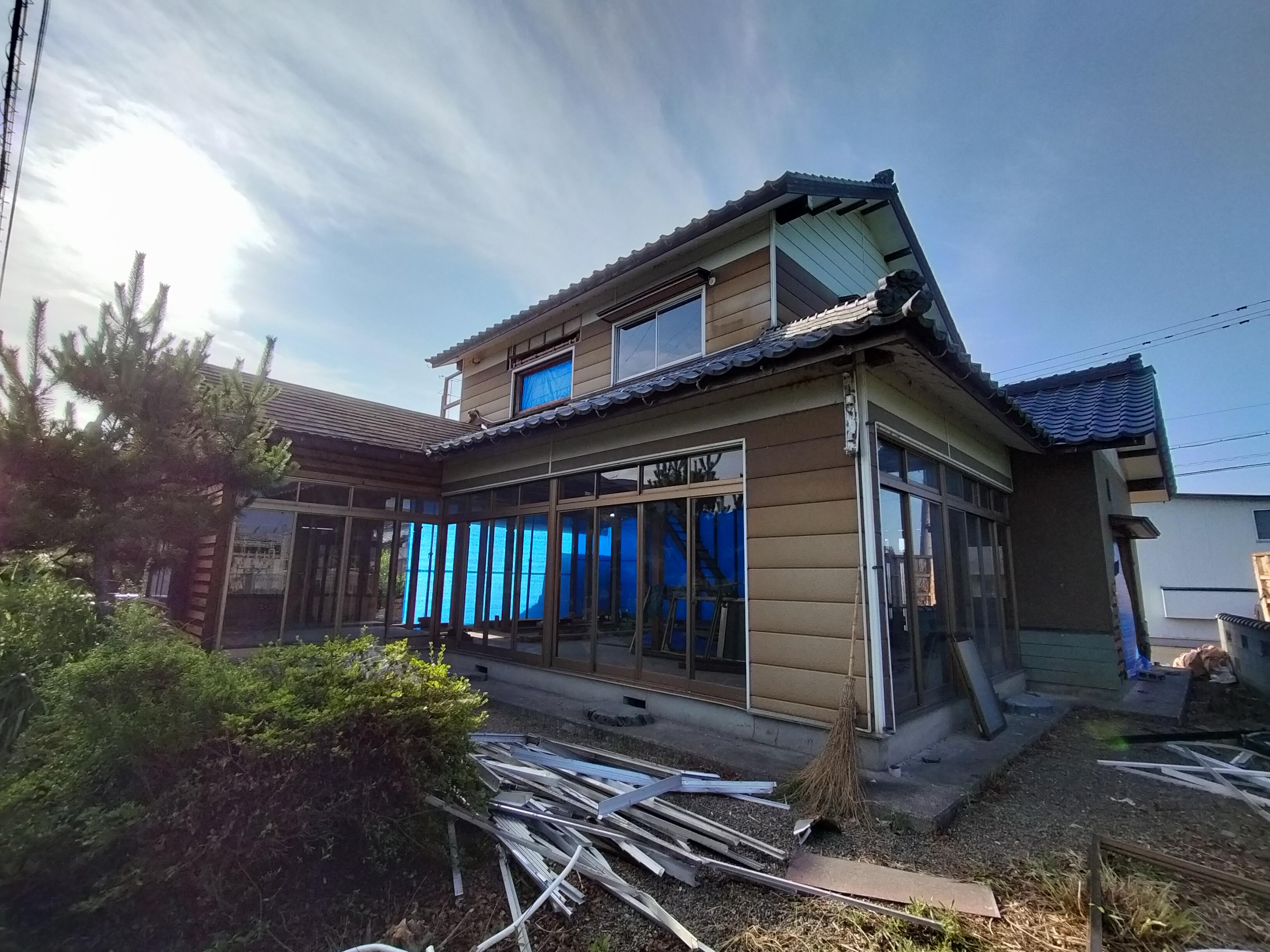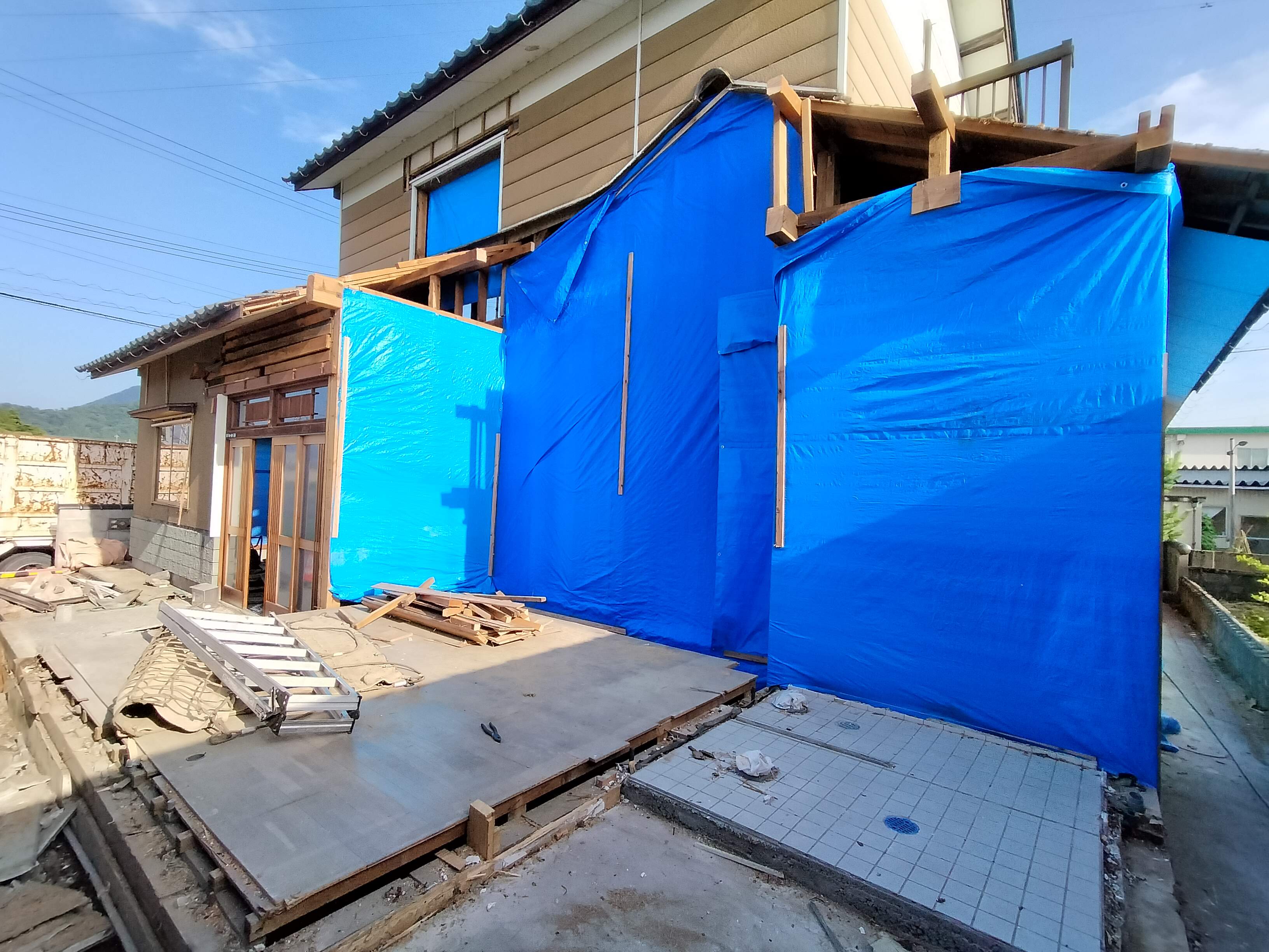 1日をかけてまずは玄関側の下屋の解体を完了しました。解体した部分はブルーシートで養生しています。今日も熱い1日だったため解体屋さんもかなり疲れた様子でした。連日ありがとうございます。