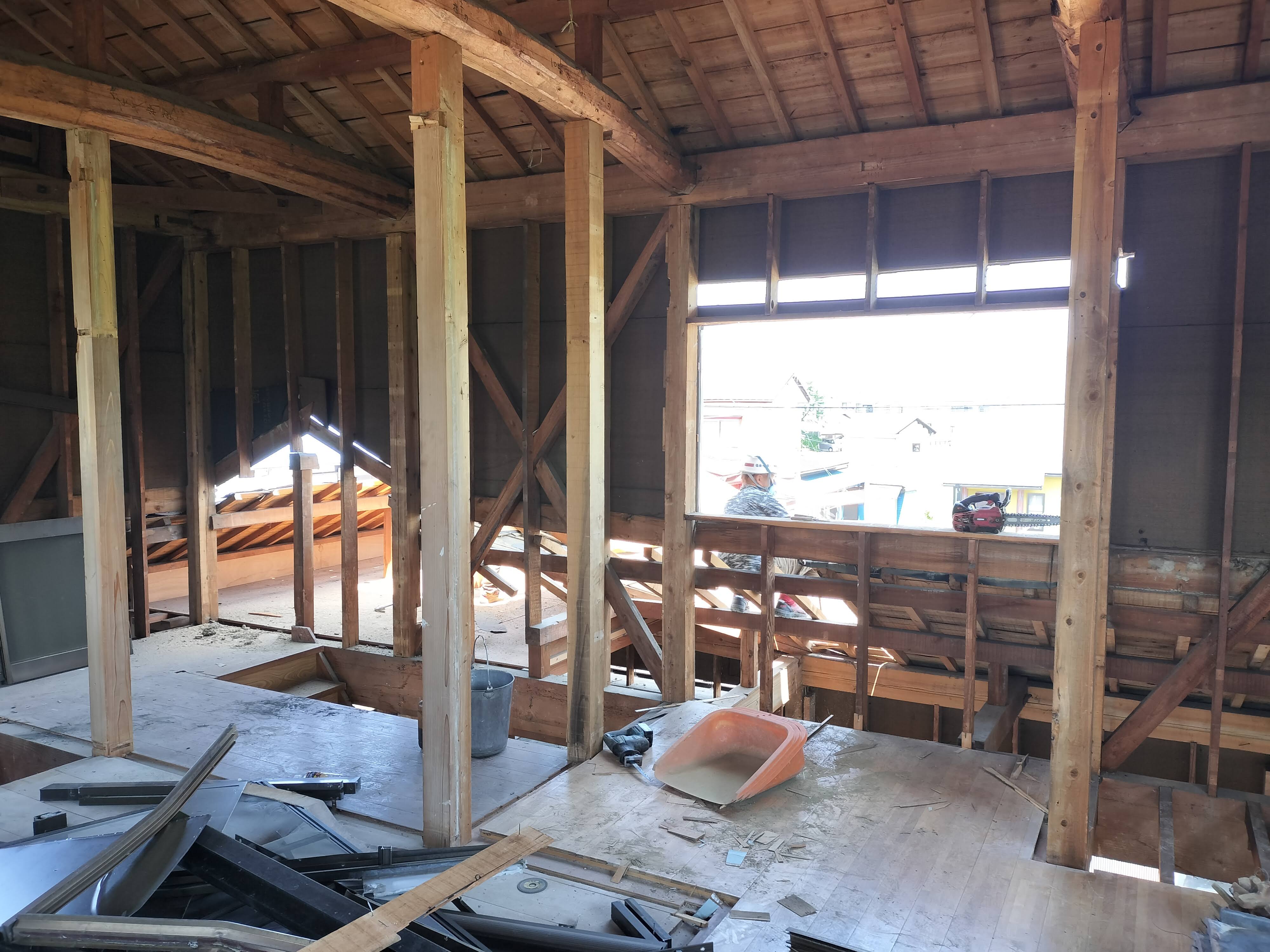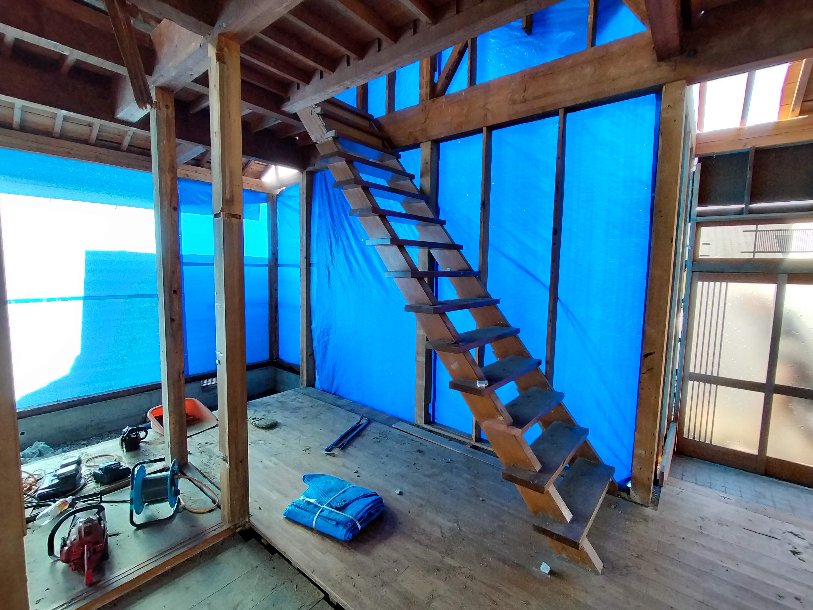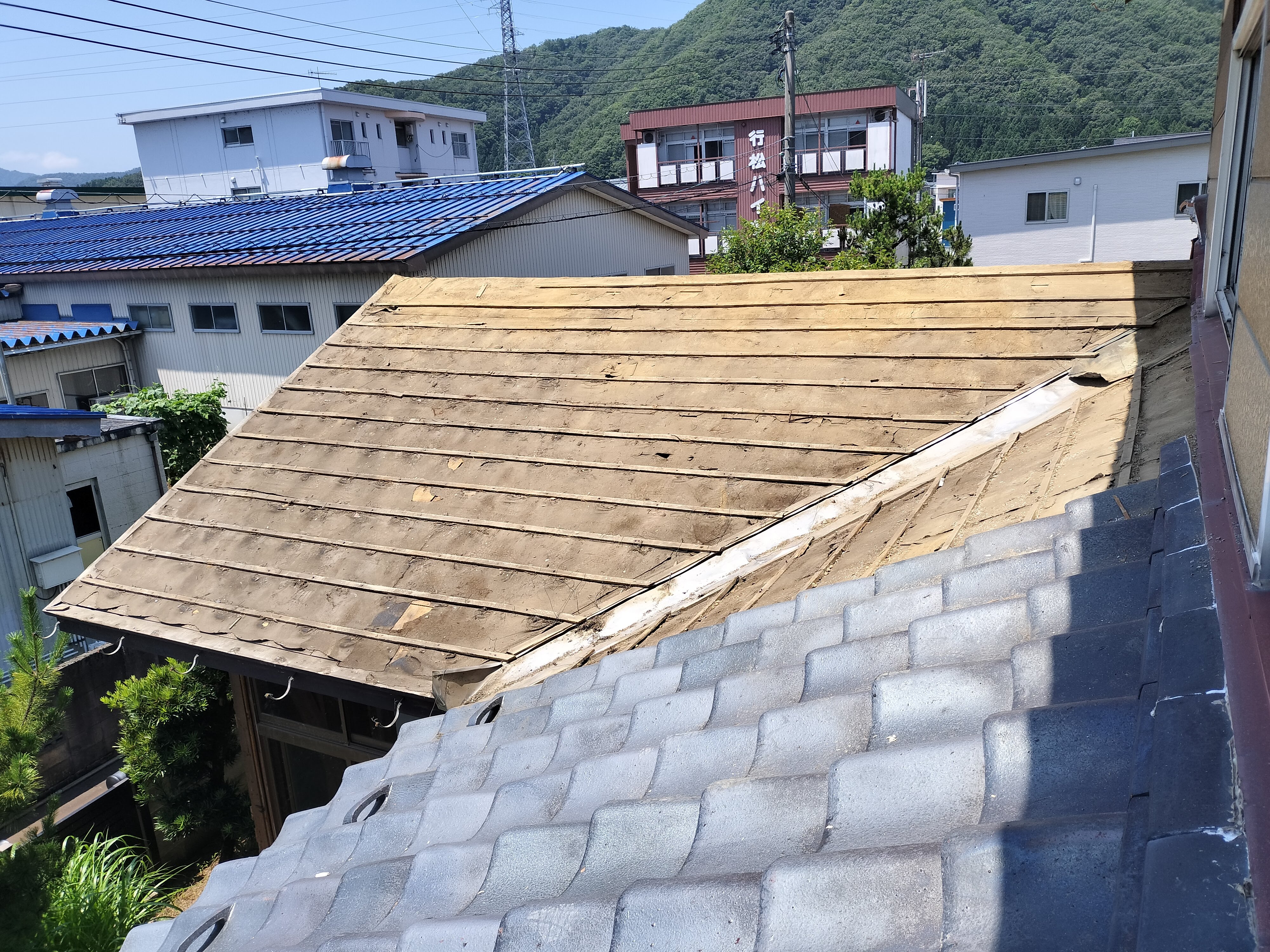 1日をかけてまずは玄関側の下屋の解体を完了しました。解体した部分はブルーシートで養生しています。今日も熱い1日だったため解体屋さんもかなり疲れた様子でした。連日ありがとうございます。