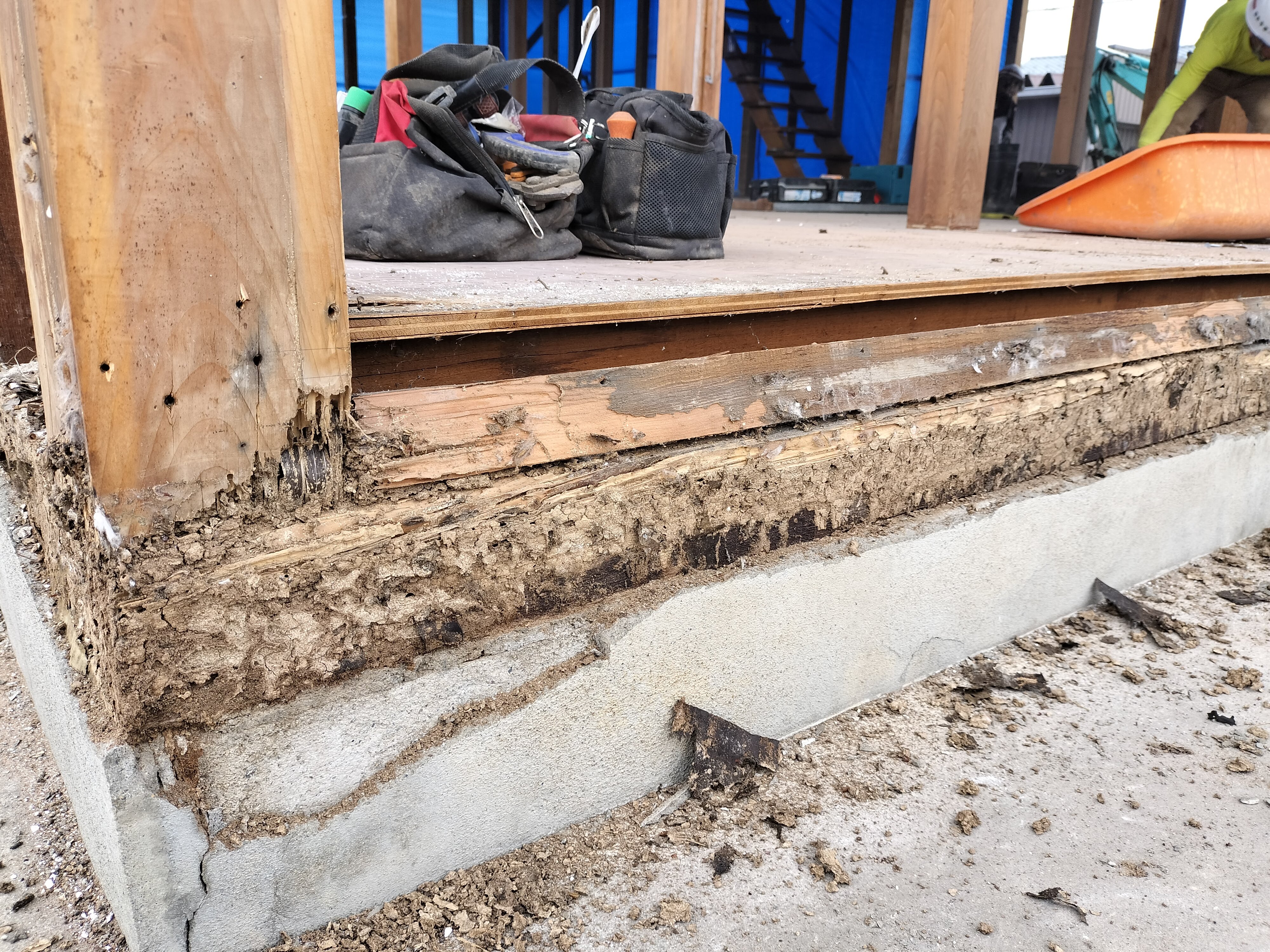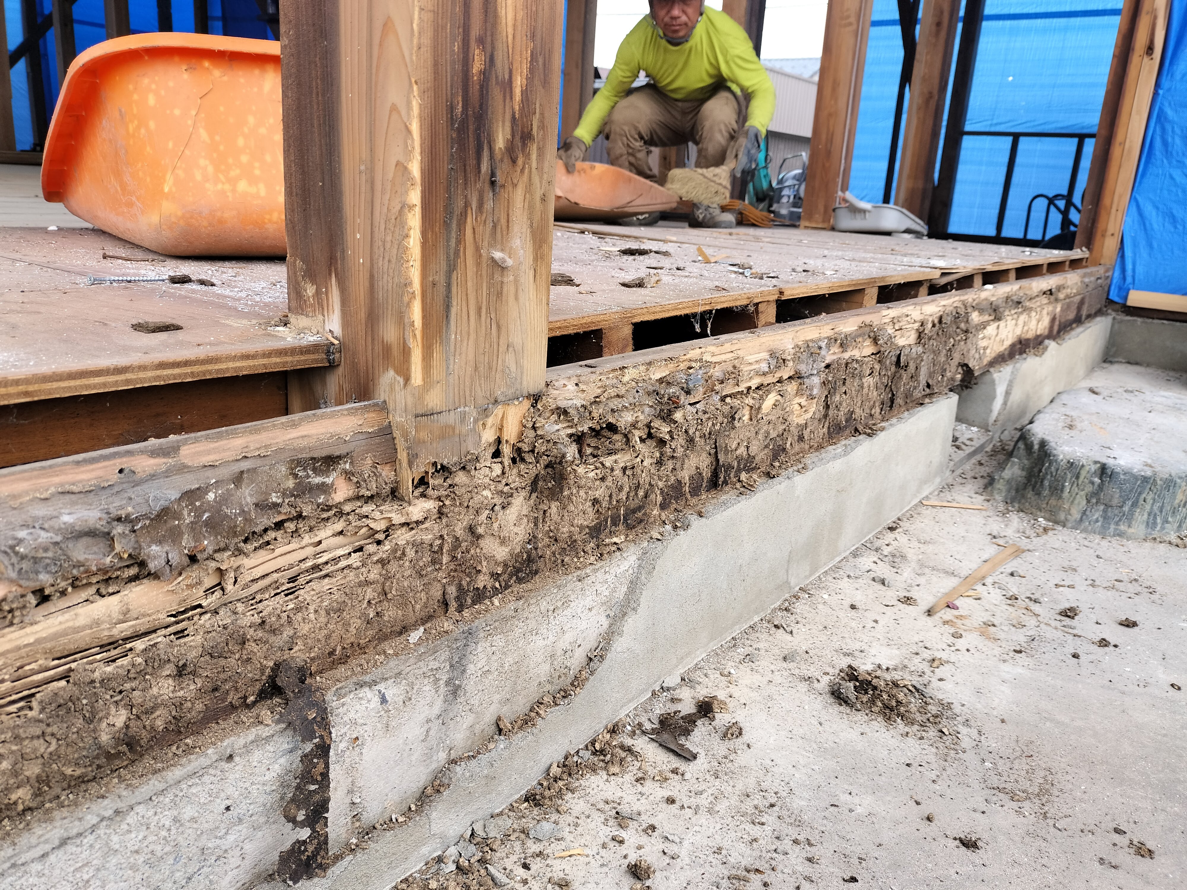 外壁の解体に伴いモルタルを剥がすと土台・柱に蟻害を発見。屋内側から確認した際には全く分からなかったのですが、かなり酷い蟻害です。この場所は、通常は基礎部分にのみ塗るモルタルが土台まで塗られており、モルタルの裏から白蟻が侵入したのだと思います。