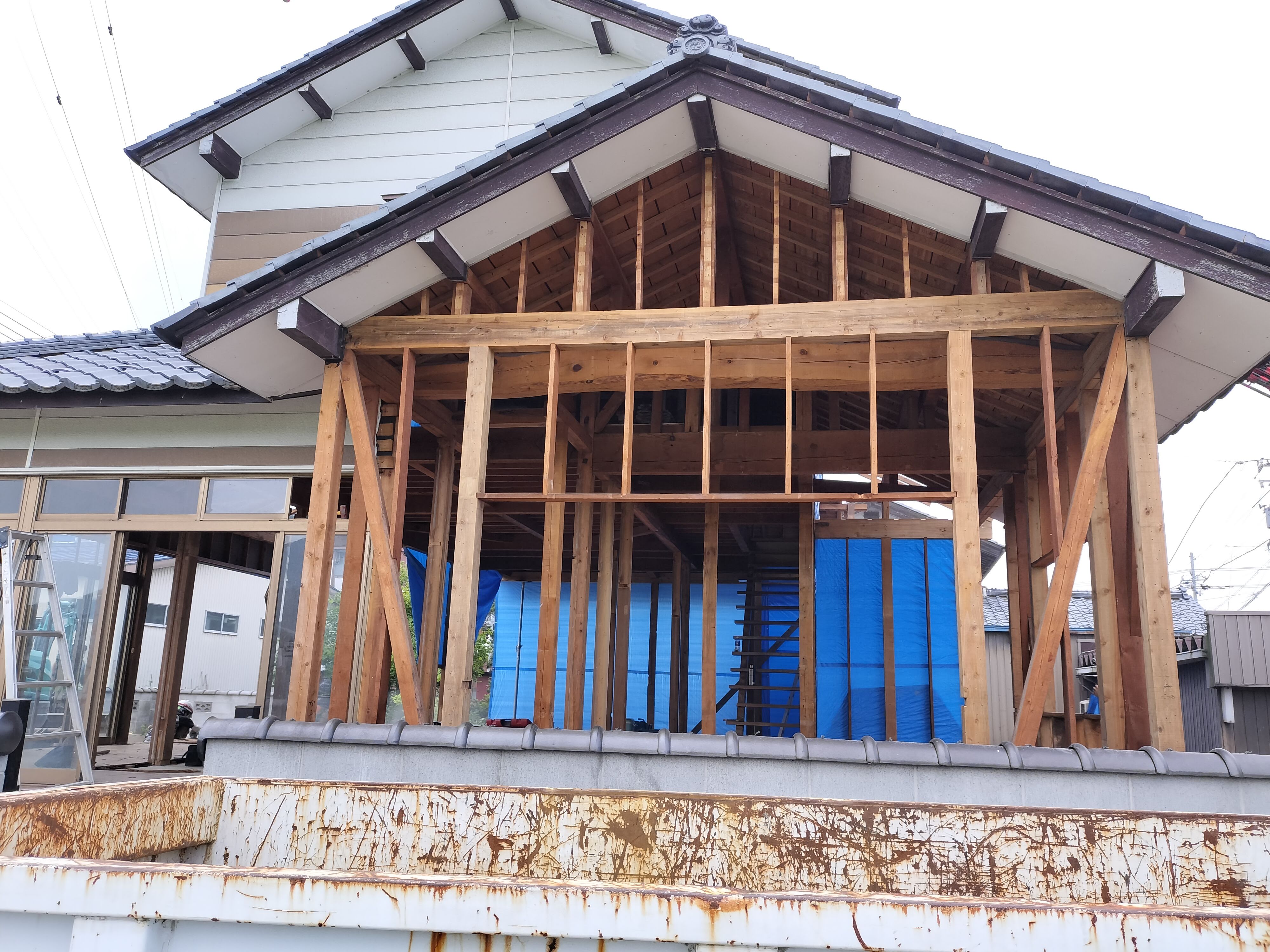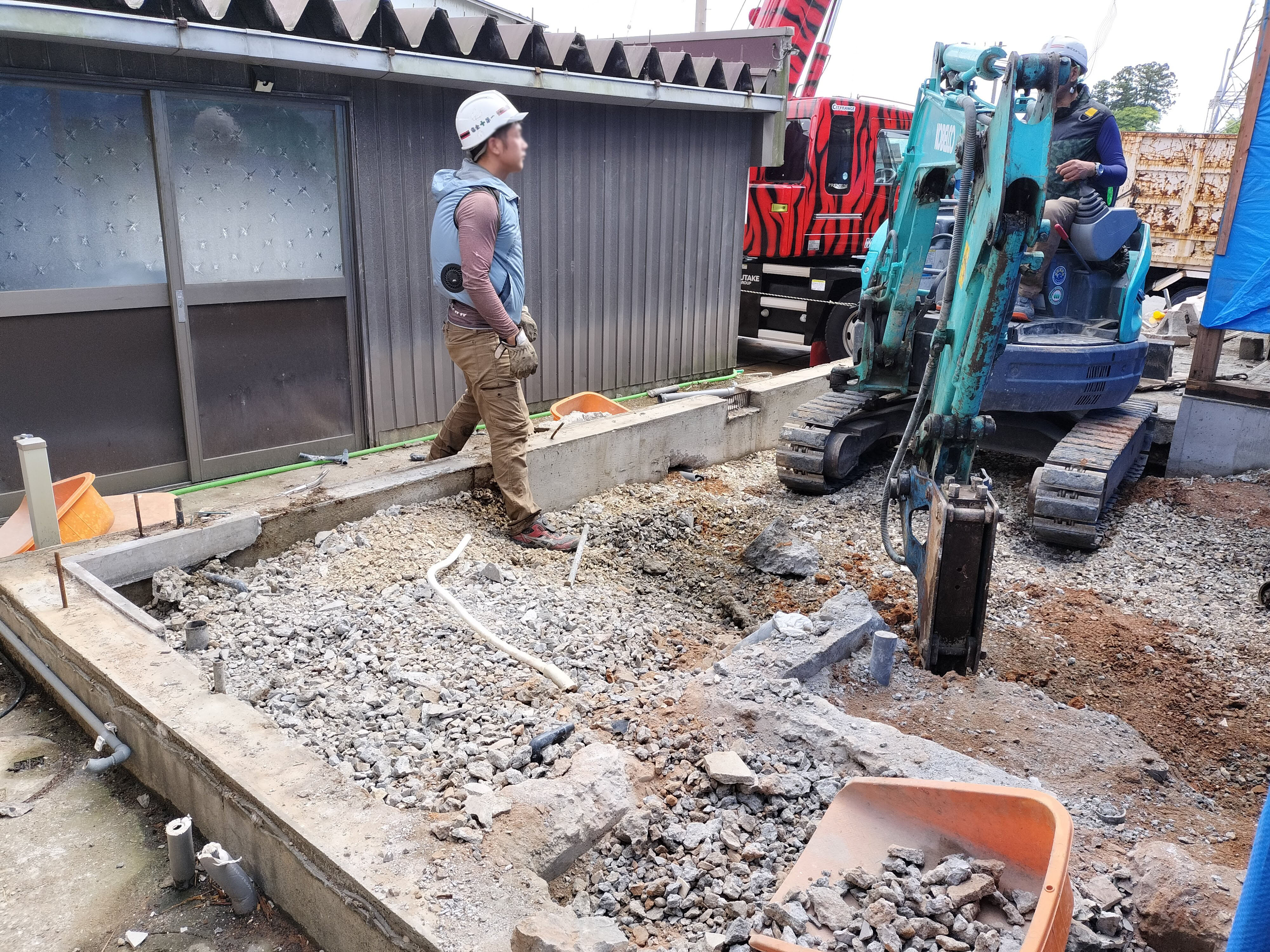 解体工事も本日で12日目になりました。基礎や外壁、庇などの解体・撤去を行いました。