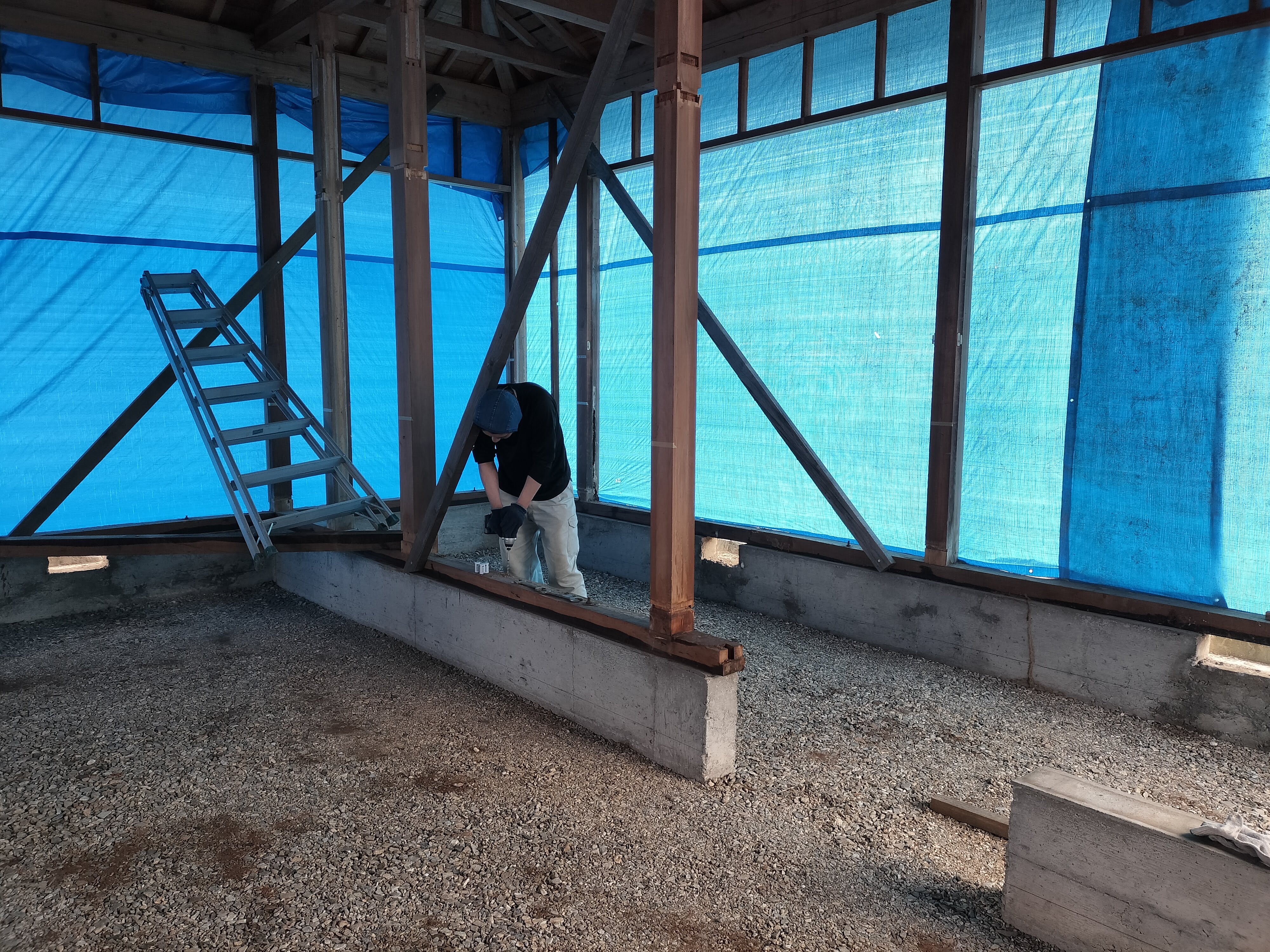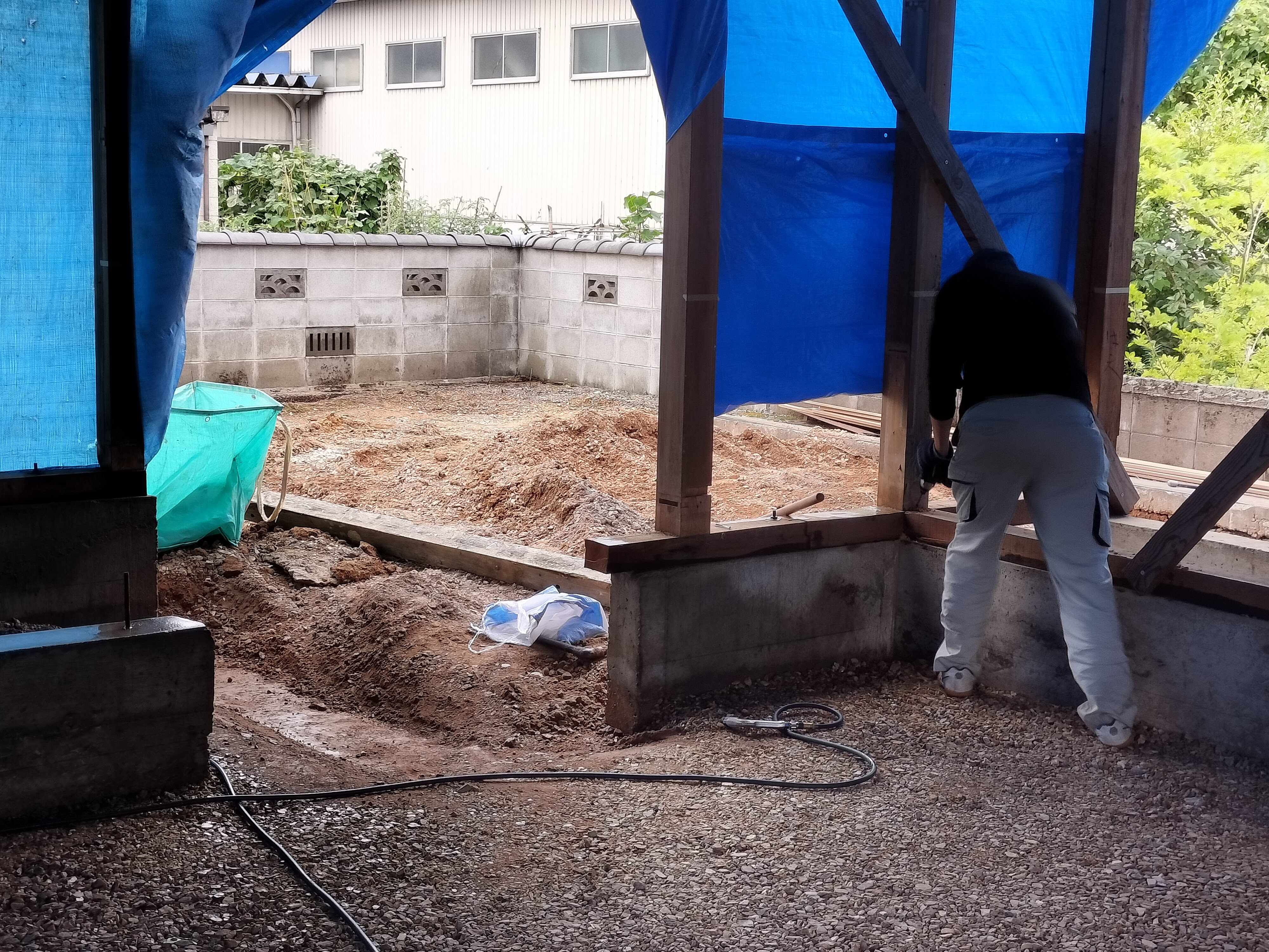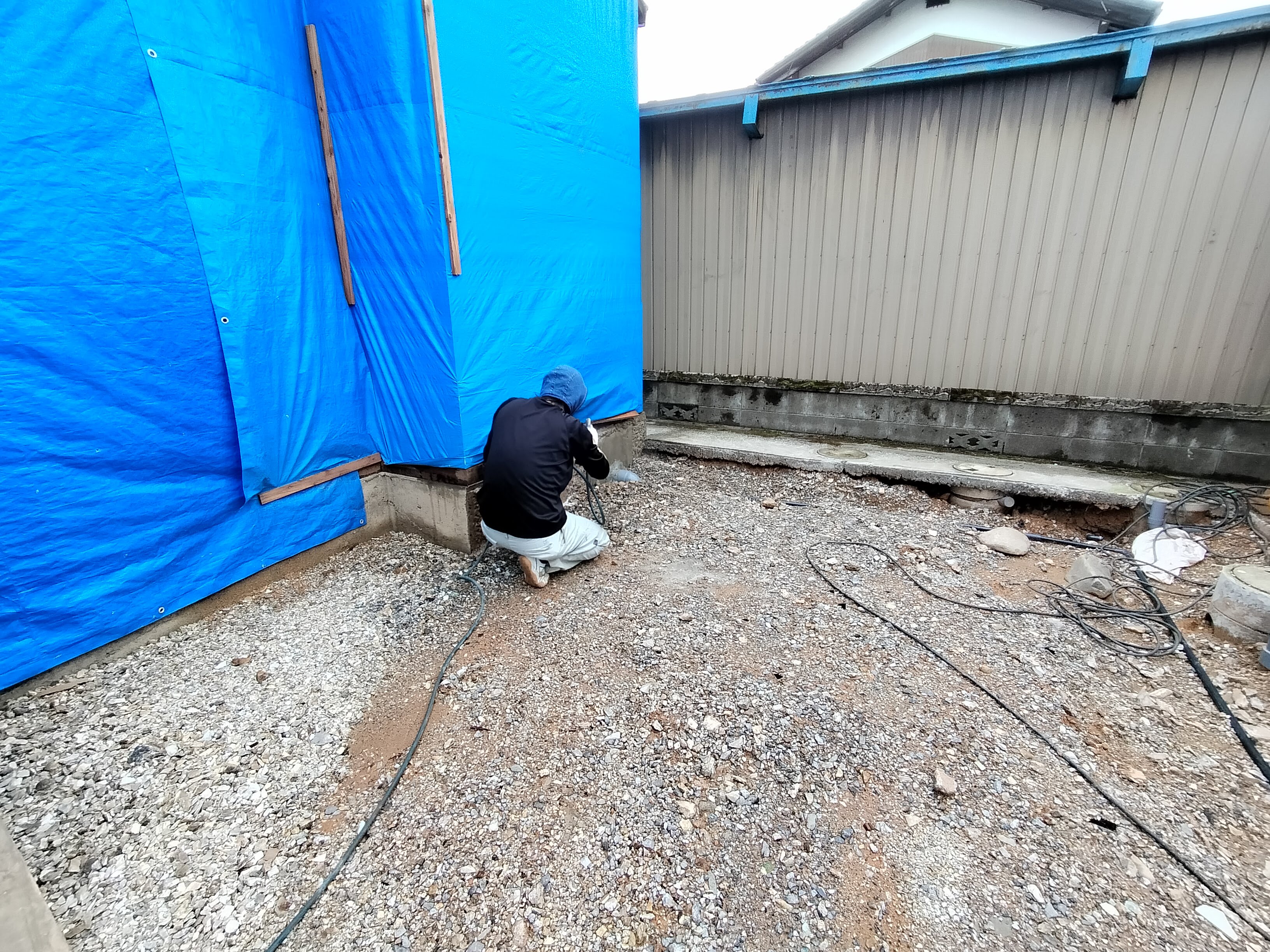 今日は午後から越前市H様邸リノベーション工事の土壌防蟻処理と蟻害がある木部の穿孔防蟻処理を行いました。午前中にレベル調整を終えた土壌に対して薬剤を念入りに散布します。